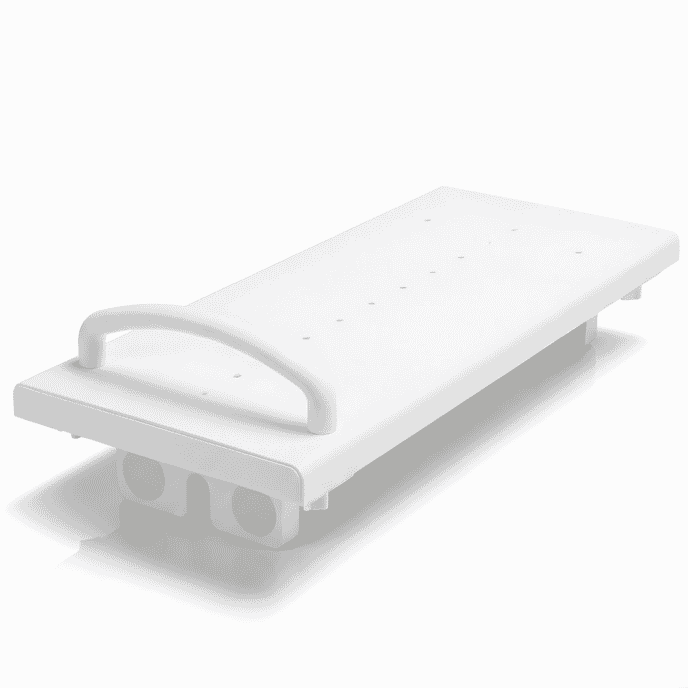 The width-adjustable design allows the board to fit a wide range of bath sizes and shapes. Securing brackets at each end can be adjusted independently, making it possible to achieve a secure fit on straight-sided baths as well as baths with a curved back. Adjustments are made in small increments to help ensure stability. A built-in handle provides additional support when sitting down or standing up, helping users feel more confident during bathing.