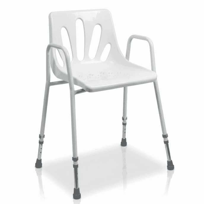 The chair features a supportive backrest and integrated armrests, offering additional reassurance and assistance when sitting down or standing up. The moulded seat includes drainage holes, allowing water to flow away quickly to help keep the seating surface comfortable and reduce the risk of slipping.
