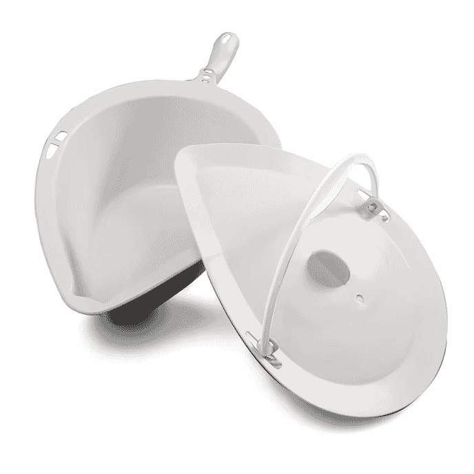 - Grey Commode Pan and Lid: The unique interior shape of this pan breaks the stream and helps to prevent splashes. The lid has a handle that locks onto the pan and ensures that the content does not spill. The pan and lid are sold as a complete product. Made of Polypropylene. Capacity: 400 cl. Requires the Pan Holders, sold separately.