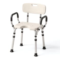The seat itself is made from tough, easy-clean moulded plastic with drainage holes to prevent water build-up and reduce the risk of slipping. Several models are available, including versions with a padded seat, backrest, and armrests for enhanced comfort and support.