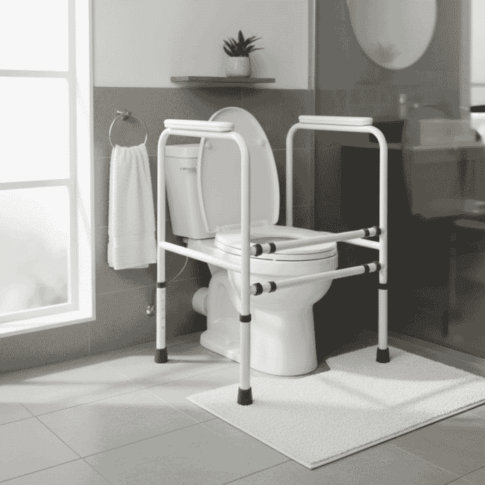 - Provides sturdy armrests for added support and leverage when getting on and off the toilet seat.