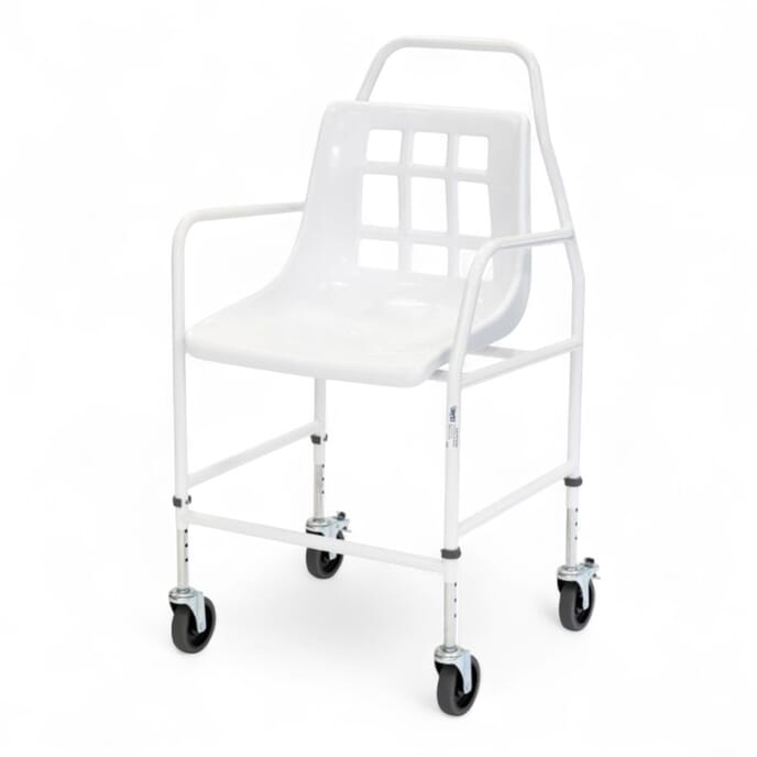 Built with a durable, lightweight frame, the chair is easy to manoeuvre and position within the shower area, even in compact spaces. It features two rear braked castors, allowing carers or users to lock the chair securely in place during use—greatly improving stability and reducing the risk of slips or movement on wet surfaces.