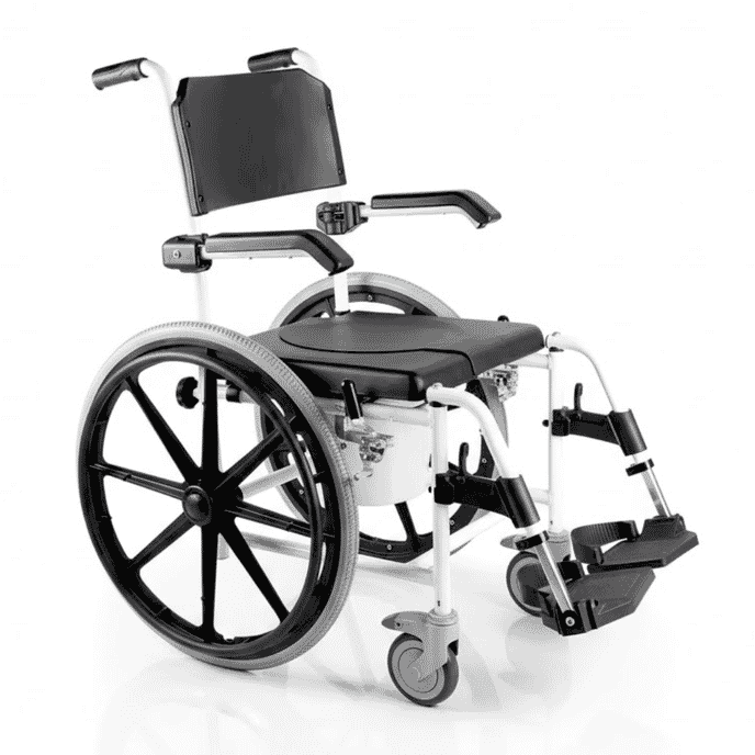 For effortless mobility, the chair features swivelling 125mm (5") front castors and 600mm (24") quick-release rear wheels for smooth self-propulsion. Rear-mounted attendant handles make it easy for carers to assist when needed. A commode pan is included, and the chair can be rolled directly over most standard toilet pedestals for added convenience.