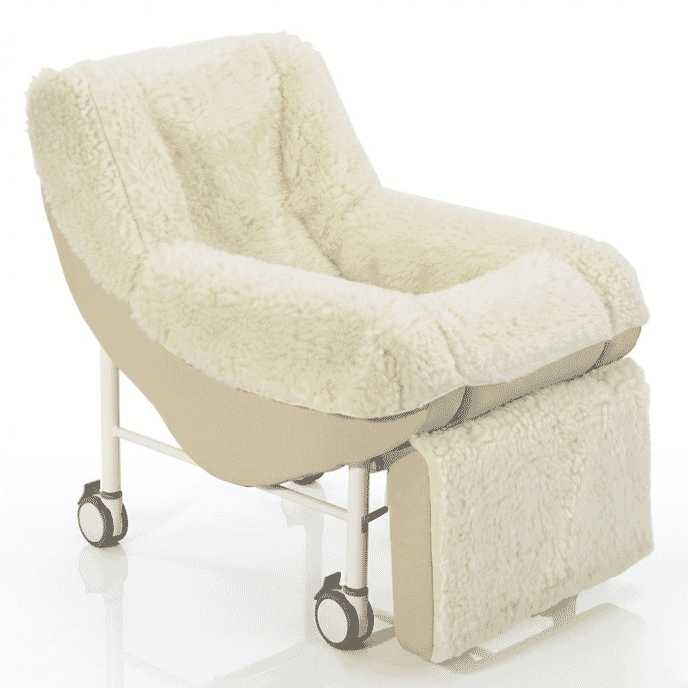 The lambswool cover offers warmth and gentle pressure comfort, helping to improve overall seating tolerance. It is machine washable, supporting hygiene standards in care settings. The overall design focuses on occupant security while maintaining comfort for longer-term use.