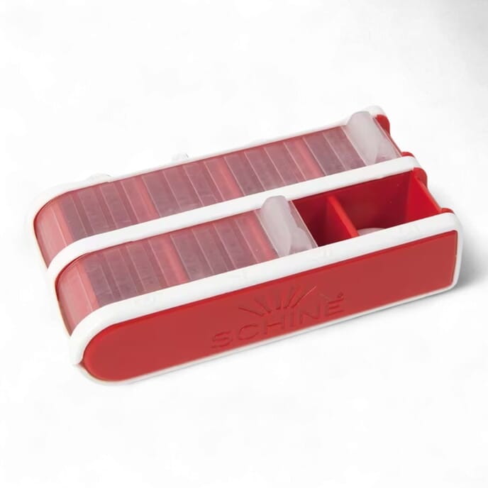 The smooth sliding action allows each compartment to open effortlessly, while the transparent shutter and coloured base (available in red or blue) make it easy to check whether a dose has been taken. Each of the eight clearly numbered compartments can hold up to 12–14 tablets (7.5ml capacity per section), providing convenient medication organisation for up to eight doses.