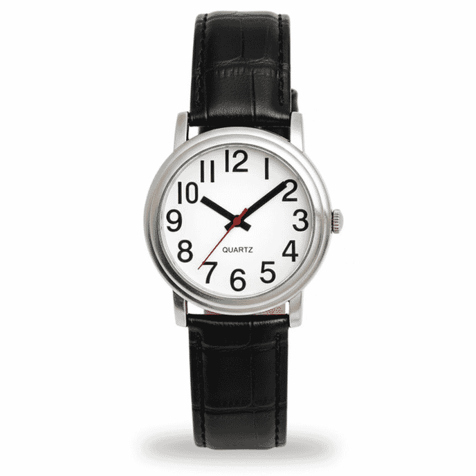 - Large white watch face with bold black numbers for easy visibility