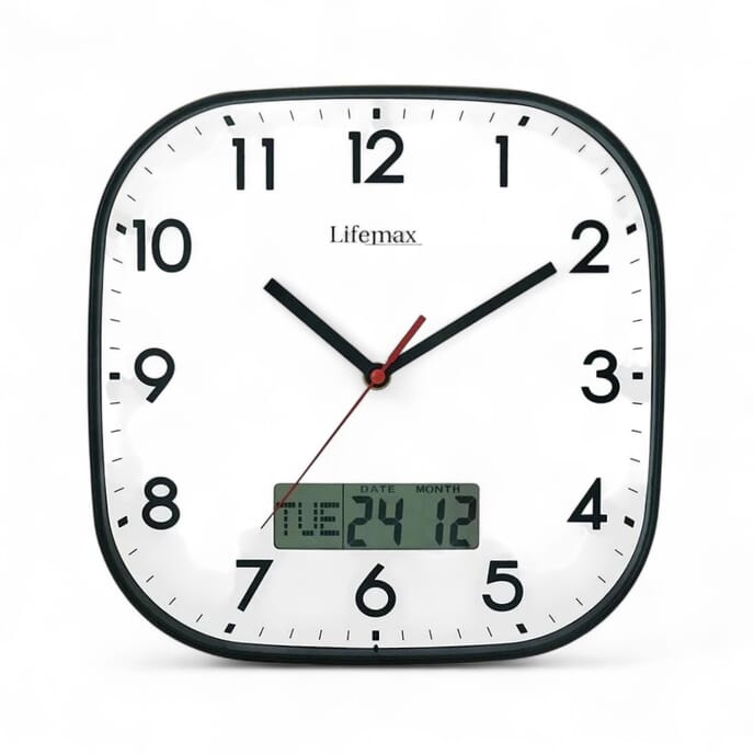 The Lifemax Clear Time Day-Date Wall Clock is a smart, dual-display wall clock combining a large, high-contrast analogue timeface with a built-in digital calendar display. With a generous 30 cm diameter and bold, legible hour markers and sweeping second hand, you can read the time from across the room. Below the analogue face, an uncluttered LCD shows Day, Date and Month in the UK format. The slim profile (4 cm depth) ensures it blends unobtrusively into any décor. Powered by standard batteries, the clock uses reliable quartz movement for accurate timekeeping. It’s particularly helpful in households or care environments where seeing the day & date is as important as the time itself.