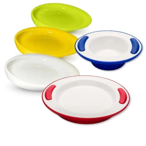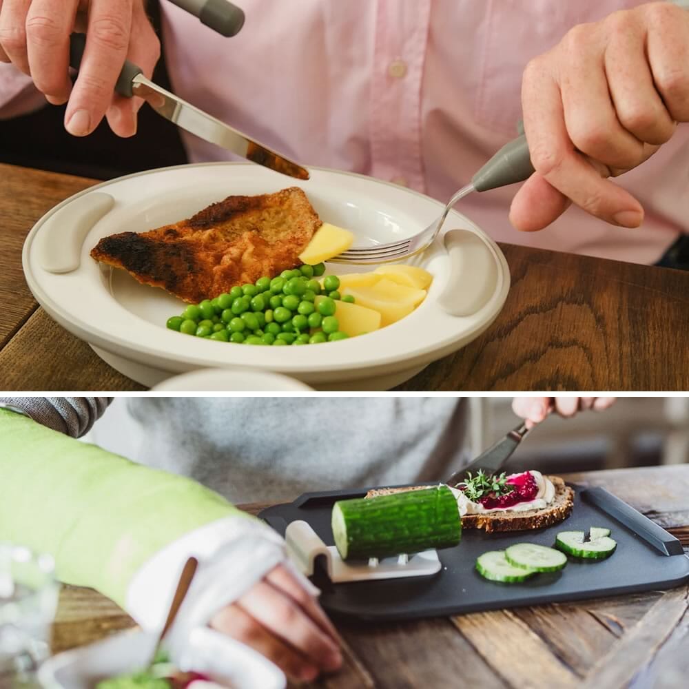 Kitchen aids and feeding aids are important tools for those with flexibility, mobility or dexterity issues. Essential Aids has carefully selected a broad range of disability kitchen aids to help with a number of daily feeding and food preparation tasks. Kitchen tools for disabled people may make conventional utensils easier to use if you have reduced hand strength, for example. Specially adapted cutlery, plates and bowls are among the kitchen aids for the disabled we supply. We also sell teapot tippers and non-slip matting which improve safety on the kitchen worktop. These are particularly useful for those with a hand tremor.