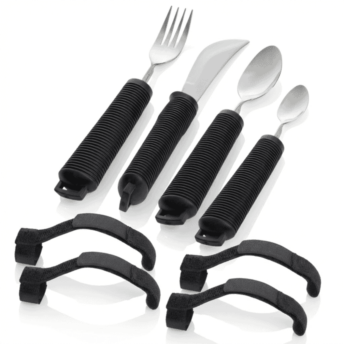The included straps provide additional support for users who struggle to hold standard cutlery securely, helping reduce the risk of dropping utensils and supporting greater independence. The utensils are dishwasher safe up to 70°C (excluding straps), making them easy to clean for everyday use.