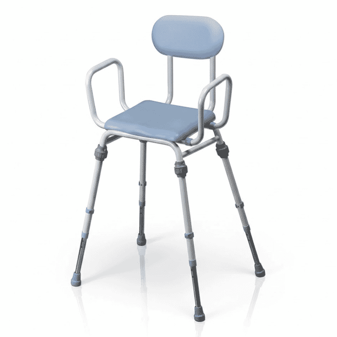 Assembly is simple and does not require tools, with easy-grip fixings that are well suited to users with reduced hand strength. Height adjustment allows the stool to be set to a comfortable level for both the user and the task, while the compact footprint makes it easy to position in smaller spaces. White and blue versions are available, with the blue option featuring a padded backrest.