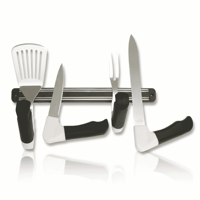 It features a magnetic strip that will securely hold around four normal-sized utensils.