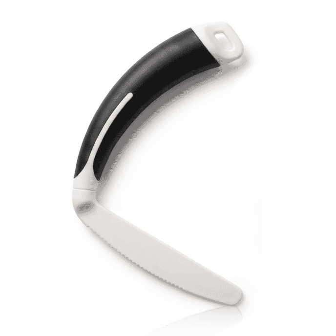 The Reflex Rocker Knife is an adaptive eating utensil designed to support more independent mealtimes for people with arthritis, limited hand mobility, or reduced grip strength. Its curved, angled blade allows food to be cut using a gentle rocking motion, reducing the need for twisting or forceful wrist movement.