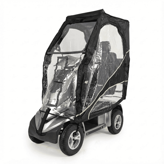 A lightweight powder coated aluminium frame supports the canopy without significantly increasing the scooter’s overall weight, helping maintain travel range and smooth handling. The waterproof nylon covering provides reliable protection from rain and quickly sheds water, keeping the inside dry and pleasant. Clear Perspex windows offer wide visibility in all directions, supporting safe navigation on pavements, in car parks and through busy areas.