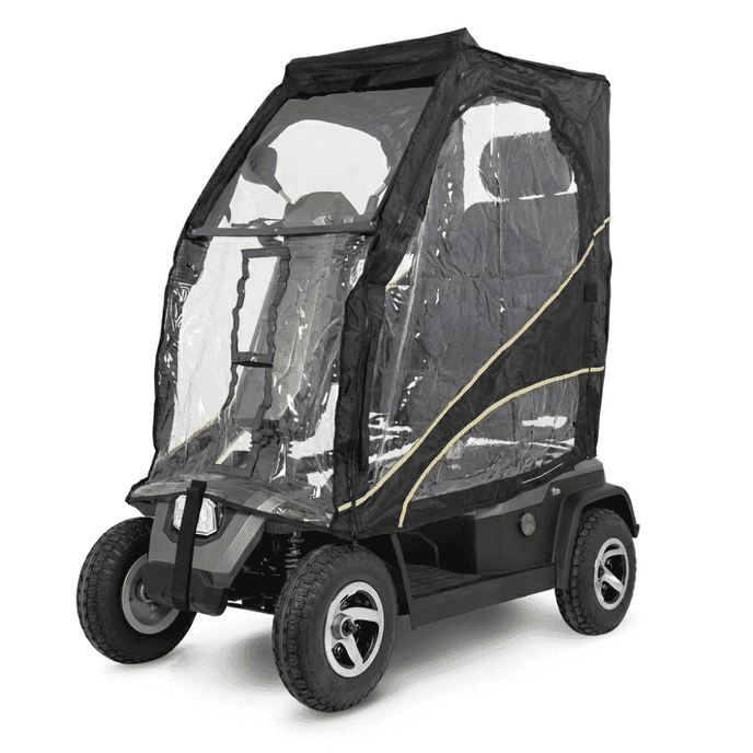 Large Perspex windows give clear visibility in every direction, including a shatter-resistant front panel for confident use in busier environments. The zipped polypropylene side doors can be opened fully for ventilation or left closed to maintain warmth and protect against cold or damp weather. These access panels also make it easier to step onto the scooter without obstruction.