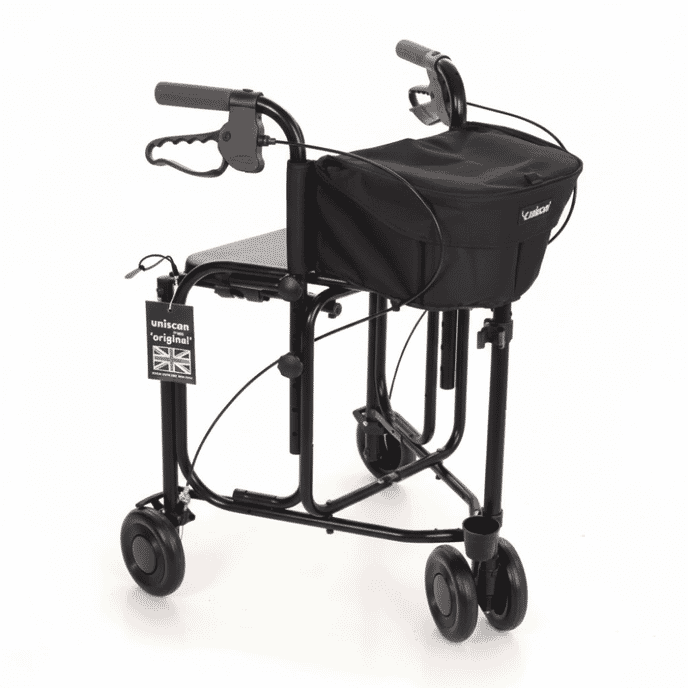 The Uniscan Triumph Rollator is a premium 3-wheel walker that combines lightweight design with practical features like a built-in rest seat, shopping caddy, and walking stick holder.