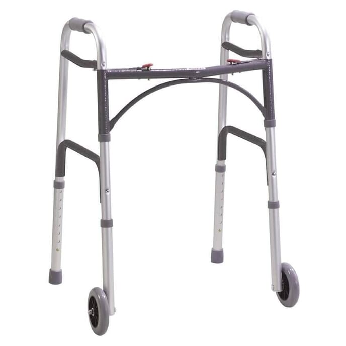 An adjustable width feature allows the frame to be narrowed when needed, making it easier to move through doorways or tighter spaces. The frame also folds down for more convenient storage or transport.