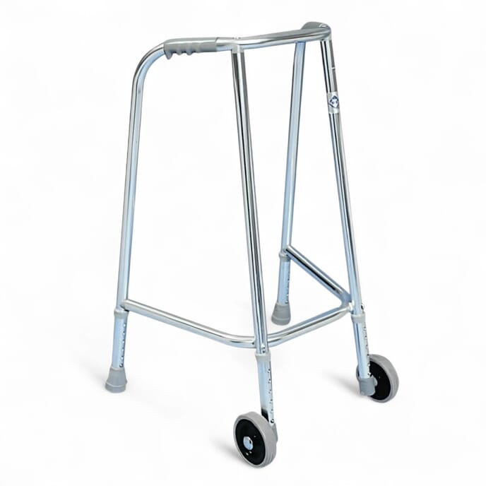 The Slimline Wheeled Walking Frame is a lightweight and practical mobility aid, designed to provide reliable support for everyday use. Manufactured in Britain from durable aluminium, the frame is fitted with rubber-tyred wheels on the front legs to make movement smoother and easier, especially on indoor flooring.