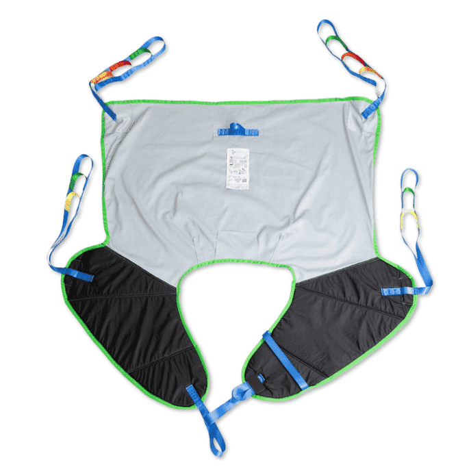 Slide sheet fabric on the leg sections helps the sling move more easily into position and can assist with repositioning during transfers. Hip support and the contoured leg design help maintain a stable seating position while the user is suspended.