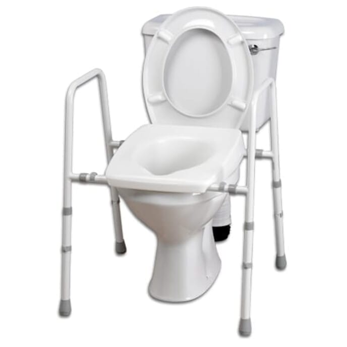 This adjustable toilet frame with moulded seat is well-suited to home or care environments, offering a versatile and secure solution for individuals with reduced mobility or strength.