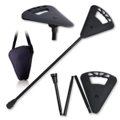 - Combines walking stick and portable seat functions with a folding ground plate for stability